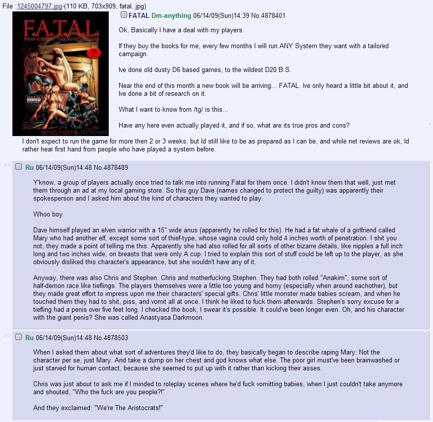 I really dislike kill happy games like that and the thought of a DM becoming kill happy really turns me off of ever playing with them, dood. I get that it's supposed to be hardcore gaem, but it just seems like it'd really stifle people's creativity after a while. Why even bother coming up with a cool backstory for this guy if the DM can just arbitrarily decide a rock falls on my head, I happen to roll a 1, and get killed before I can even do anything cool? If I do come up with a cool character and he gets killed by some random **** , there's no real acceptable way to do anything with him without just reusing the same guy over and over and that'd be lame, dood.