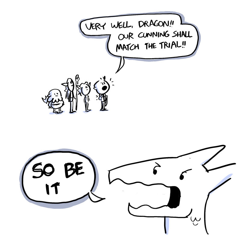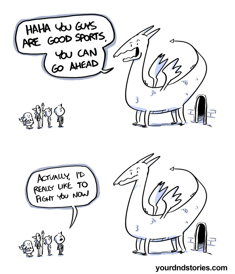 "In the actual submitted story, they included that the character who demanded to fight the dragon actually did fight the dragon, and that the dragon killed him. I would’ve included that, but I didn’t want the comic to drag on."