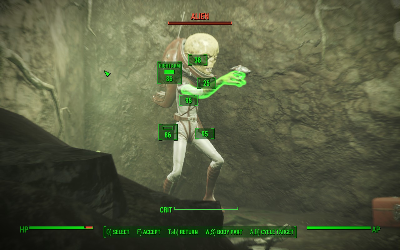 all the cave has is the alien with the alien blaster, a pistol weapon, and thus useless unless you put points in that perk