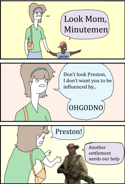 So what you're telling me Preston is that a super mutant managed to sneak across the ocean to my fully walled in island settlement, which has a defense rating of over 200; he then got past my modded sentry bot and protectron home defenses, and kidnapped a settler who was fully equip with heavy combat armor and a fully modded gaus rifle; he then carried said settler halfway across the commonwealth without anyone even noticing. FOR THE THIRD TIME!