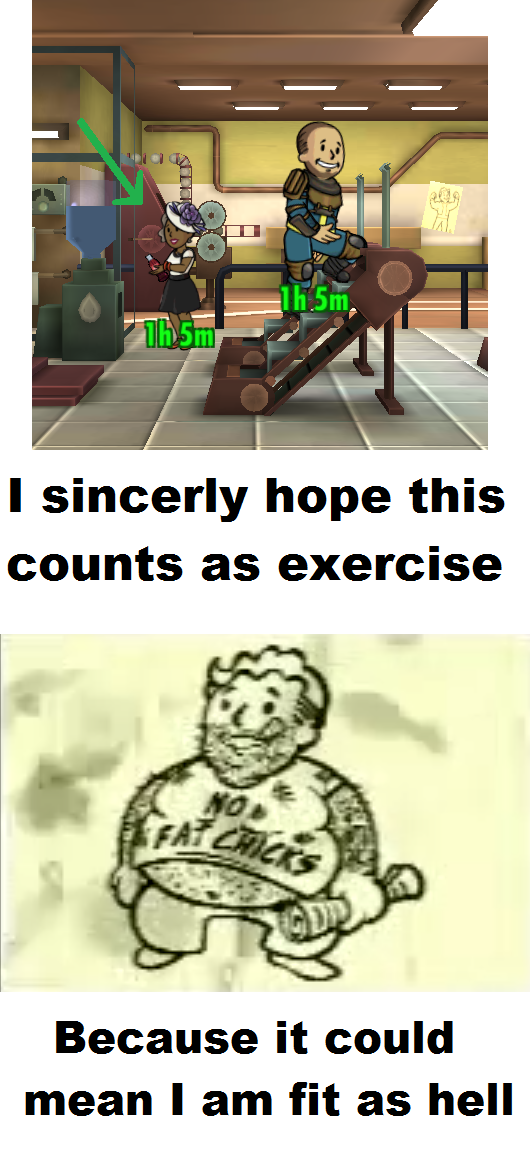It always bother me that when you make training rooms the dwellers sometimes just stand around. Like if you only have a single Agility room one will sit on the floor doing sit-ups and the other one will just stand there with a clipboard. It seems lazy.