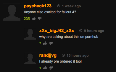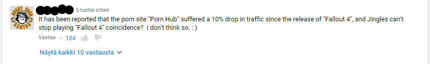It has been reported that the porn site "Porn Hub' suffered a 10% drop in he We since the release of "Fallout 4", and Jingles can' t