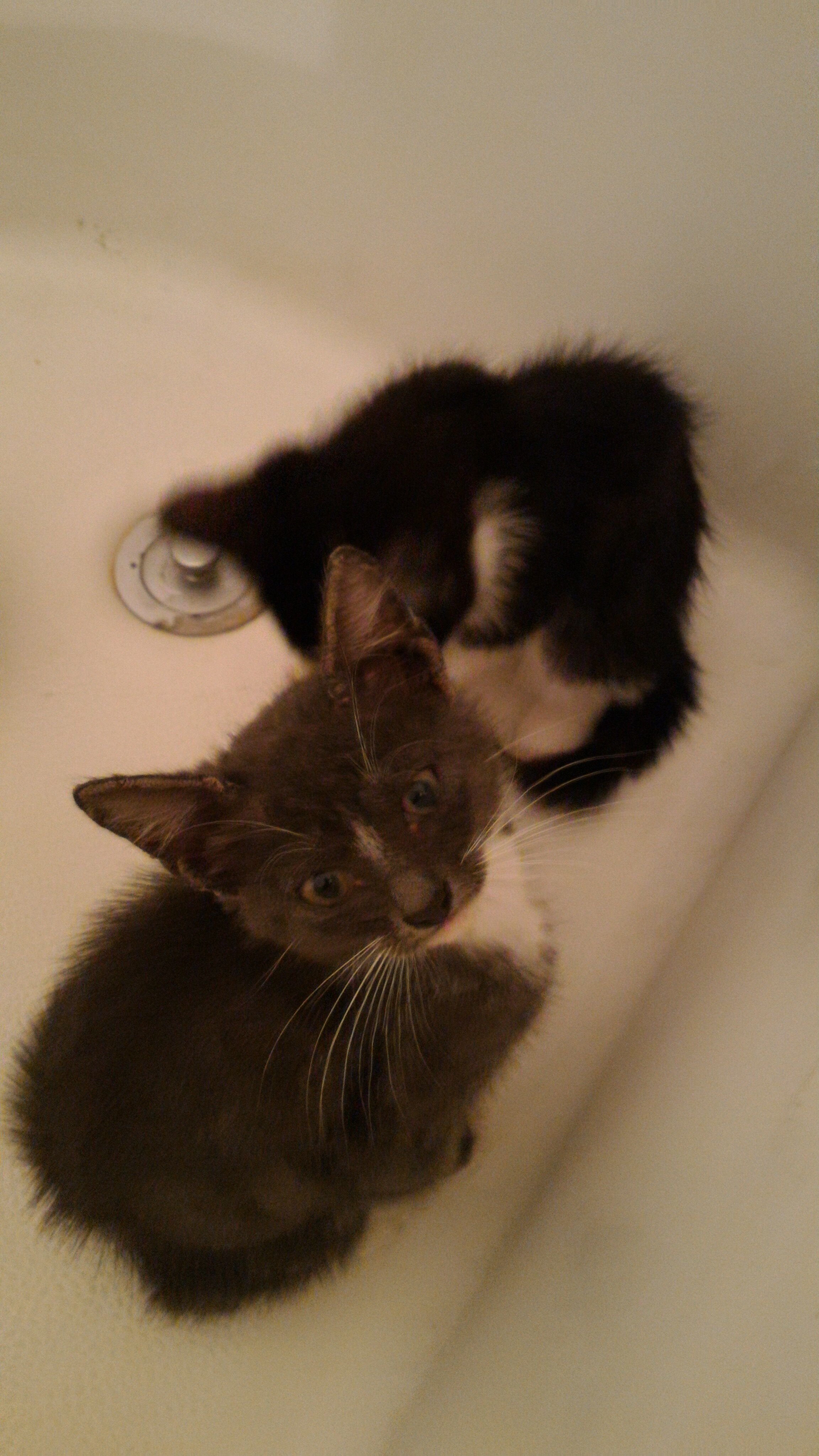 I found these two little guys behind a McDickalds when my gf and I were on our way back to her apartment. They didn't have a mother there so we grabbed them and brought them back with us, got them some food and bathed them. We can't keep them at her apartment or mine but a friend who's dad is a vet is coming to grab them tomorrow.