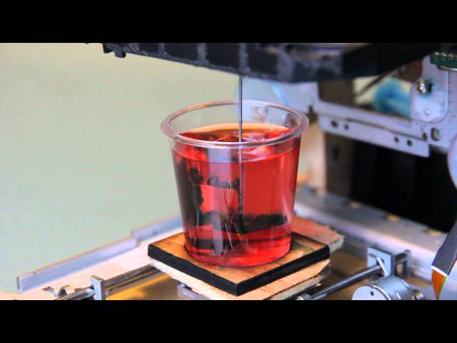 This is a close-up of my figures-in-jello-printing 3d-printer hack. Content of the shot glasses is jello (duh), printing fluid is a mixture of banana liquor, food colouring and starch to make it less viscose. Printer is made out of old cdrom drives. Article on how it's made is online at You need to login to view this link