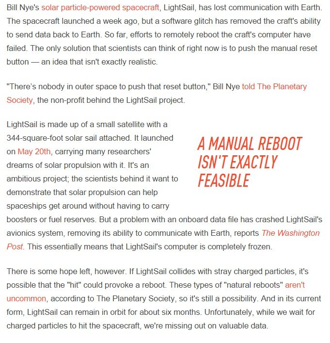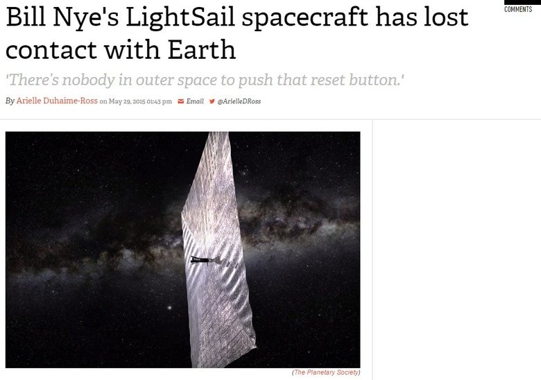 www.planetary.org/blogs/jason-davis/2015/20150526-software-glitch-pauses-ls-test.html?referrer=www.popsci.com/planetary-society-loses-communication-solar-sail-spacecraft?referrer=www.washingtonpost.com/blogs/the-switch/wp/2015/05/29/oh-no-bill-nyes-solar-sail-spacecraft-has-lost-contact-with-earth/?postshare=7001432920843592