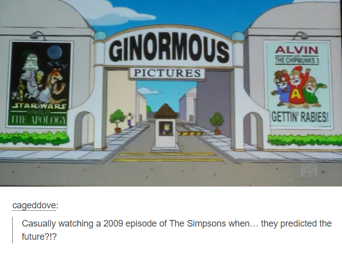 I'm not doubting the party shindig or the fact that the simpsons adds references, more the dudes logic that Matt G knew in 2006 that Episode VII of star wars would be release the same time that a third alvin and the chipmunks movie was because of the party and that it wasn't a coincidence.
