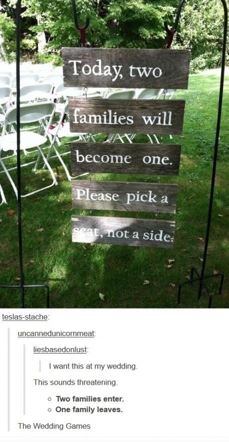 If my current boyfriend and I go through as we've planned, my family is made up of a bunch of alcoholic, occasionally obnoxious party animals who don't keep their opinions to themselves. His is made up of the kind of people who think if it's not approved by the Bible then it's okay to be a bigot. Like, where everything in America is a Muslim conspiracy