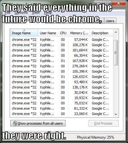 I don't get how people still use Chrome? Oh, yeah, let's use a browser that steals all your data AND is a bigger resource hog than Crysis games that won't exist for another decade.