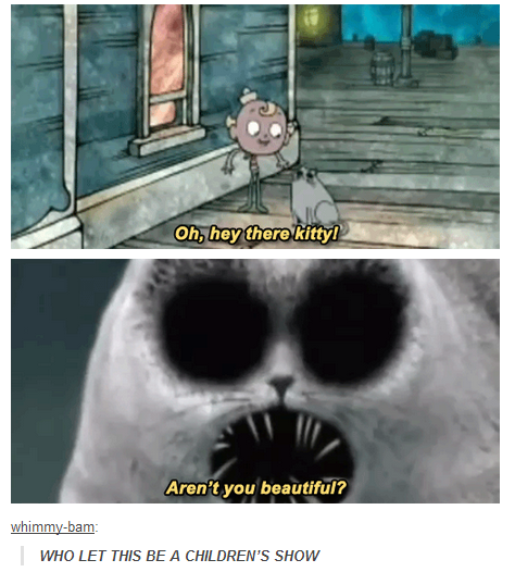 They'd say something like 'oh, my, what a cute little thing.' and then they'd shoot a close-up shot to show how nasty it was. Like this scene from The Marvelous Misadventures of Flapjack.