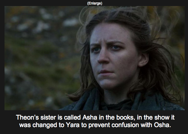 Theon’s sister is called Asha in the books, in the show it was changed to Yara to prevent confusion with Osha.