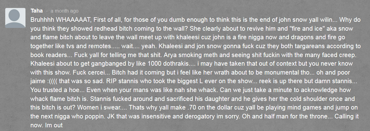 and flame bitch about to leave the wall meet up with khaleesi cuz john is a fire ***** now and dragons and fire go