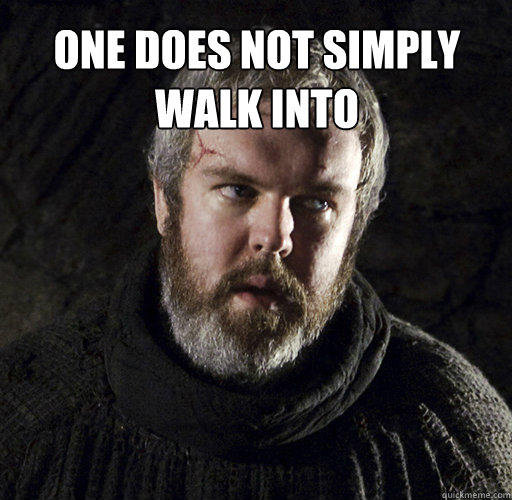one does not simply walk into... Flag doctorpoo Channel: gameofthrones (See more...) next random - Fav Favorite Comment ✖ Top NextComment next Tags: game of thrones | HODOR | funny | television | A song of ice an | TV | Got +16 Views: 3008 Favorited: 0 Submitted: 08/31/2014 Share On Facebook -Favorite +Favorite Unsub from doctorpoo Subscribe to doctorpoo Subscribe to gameofthrones Unsub from gameofthrones