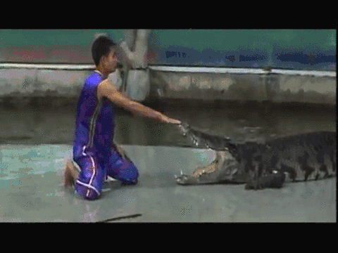 In fact, it was the first time the guy was gonna try out the trick on him, but I don't quite understand why you would perform a first-time stunt on an untrained crocodile in front of a large audience.