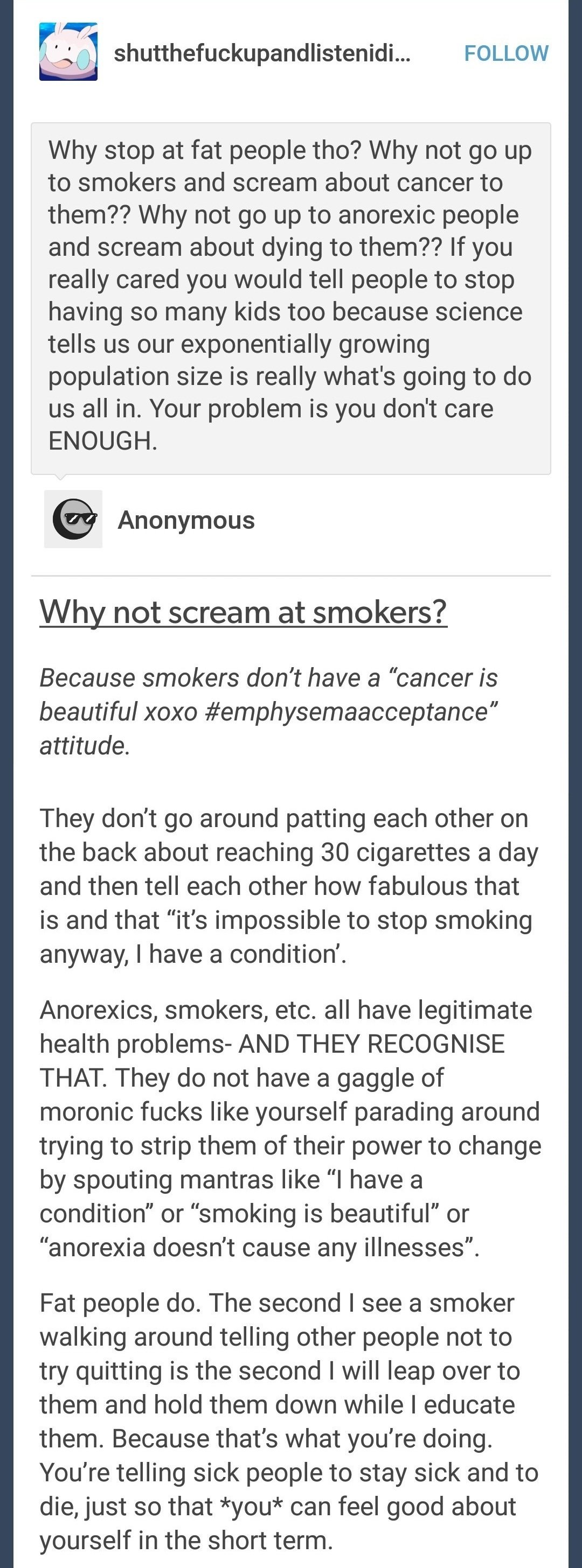 "Why not go up to smokers and scream about cancer to them??"