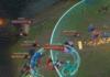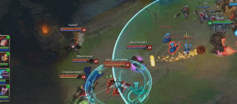 In the first part, you see a big guy with a green health bar dash in from the right. He knocks everyone with red health barsup in the air. That first blue health bar blinks in and starts doing damage to the entire team, which he can do only while they're in the air. This also stops them running away. Just as this ends, one of the guys still on the right (the one further down) uses a spell that, again, knocks everyone in the air, keeping them close, and slows them down, making it much more difficult to escape. While this happens, the last guy with a blue health bar starts dealing damage in a large cone. All the folks with red health can't escape and are killed by the one doing a cone of damage, so that player gets 5 kills at once.