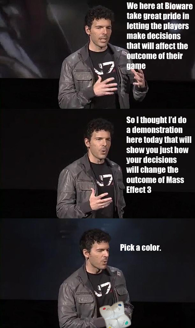I loved Mass Effect so much that it probably kept me from suicide through some hard times. Thinking about that world has let me finally sleep so many times... but the ending in ME3...