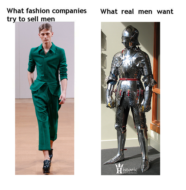 That is 100% correct, men does not need some sort of pseudo-metro-sexual greenish abomination of an excuse for a propper attire, what we need is late german gothic style full plate armour like the one worn by Archduke Sigismund of Tyrol, but the one in the pic will suffice...