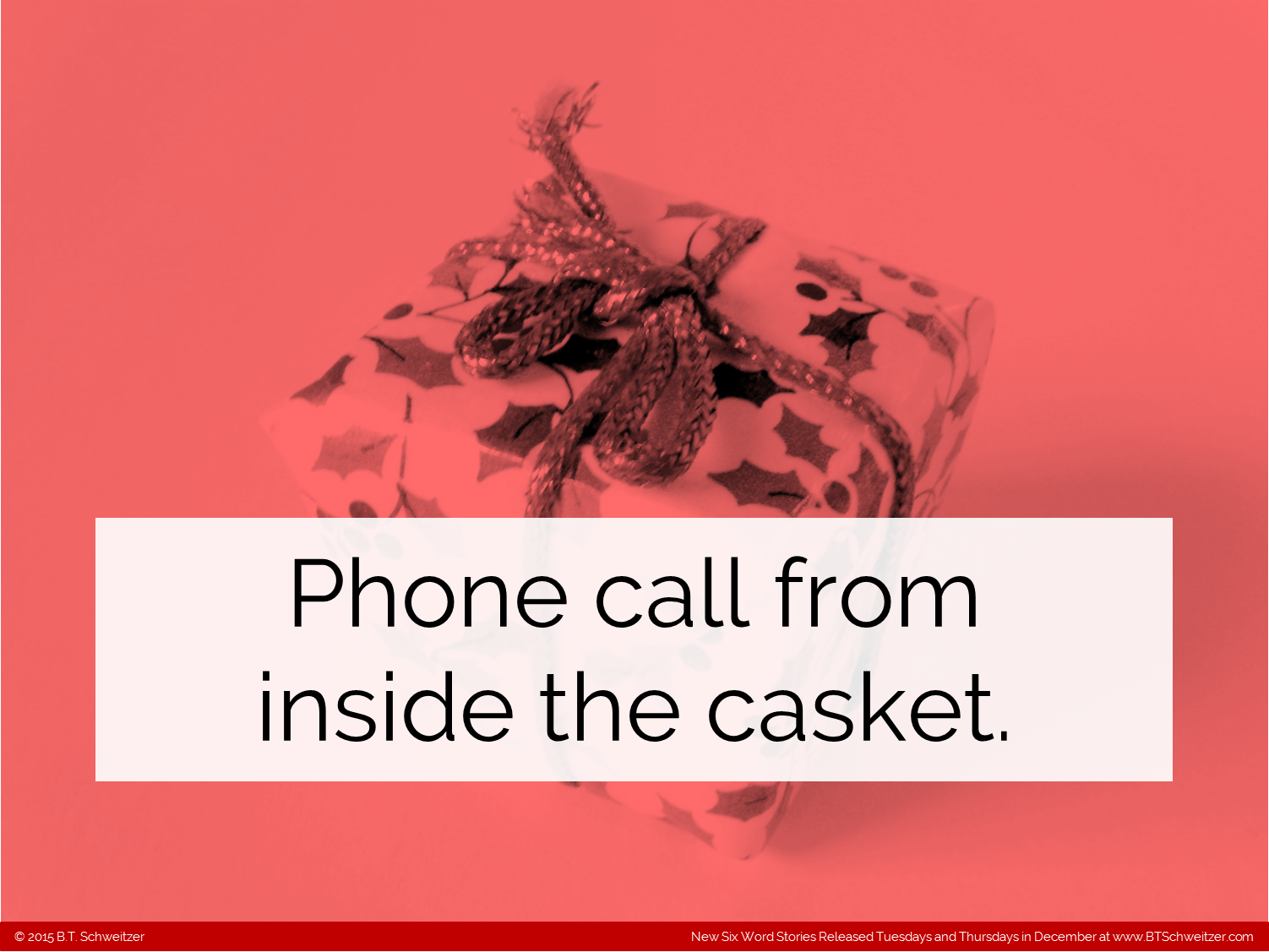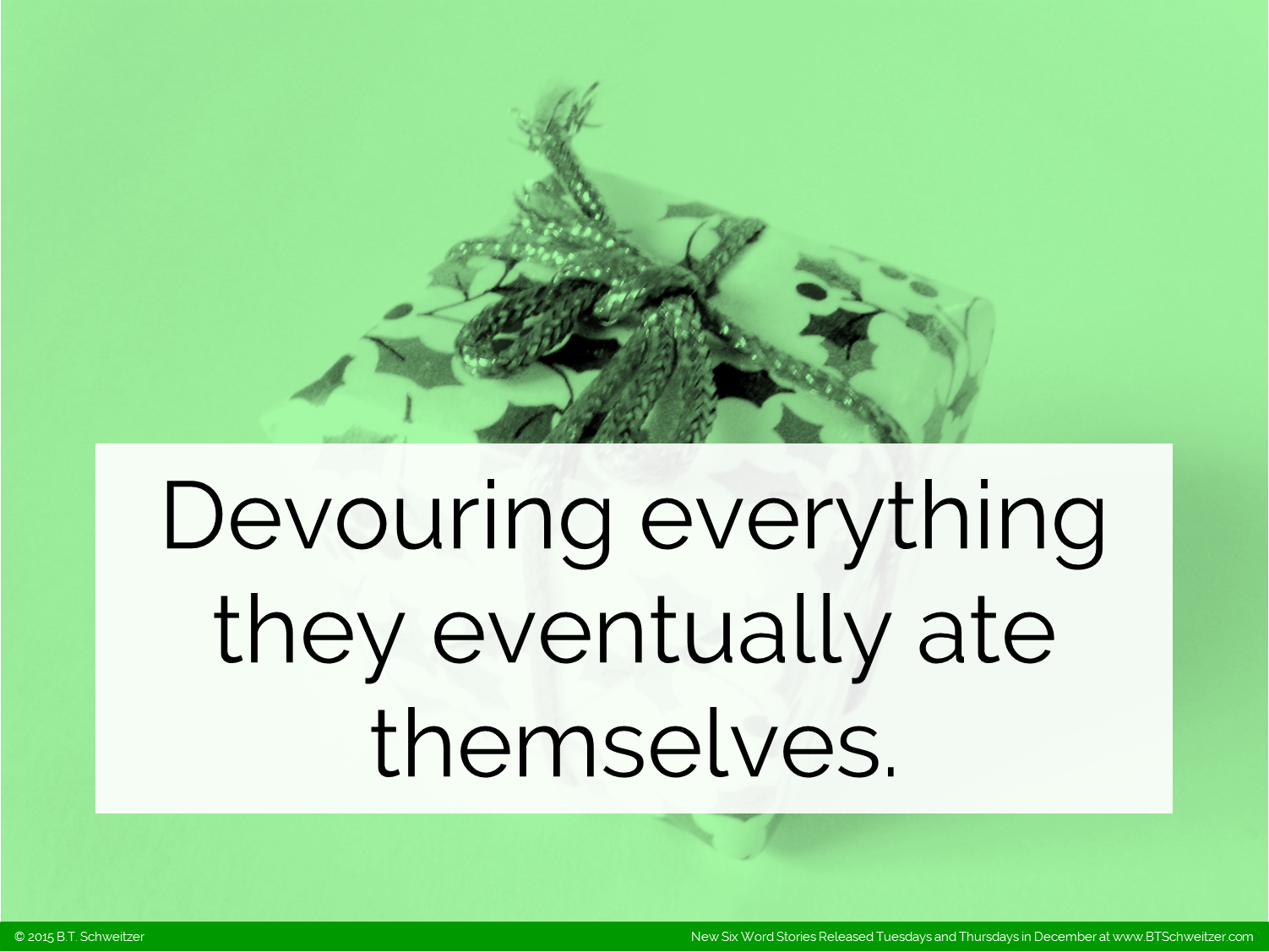 As my holiday gift to you all I'm posting 5 comps (4 Six-Words and 1 Two-Sentence) in the next 24 hours with another on Saturday and more to come next week. Also I extended this month's contest deadline to Monday and am allowing double the normal number of entries per writer. Please enter here: www.btschweitzer.com/contests/contestdecember2015/