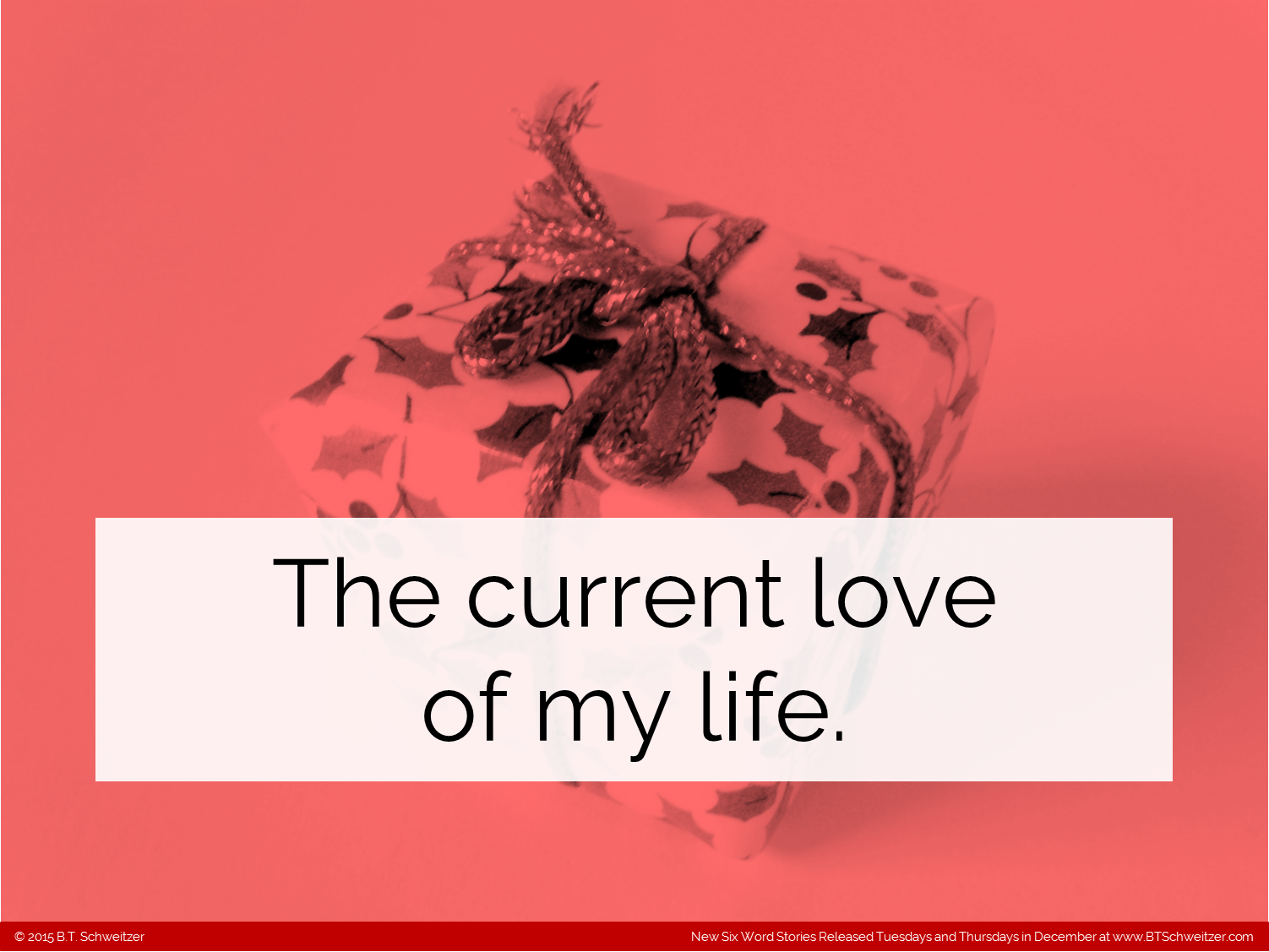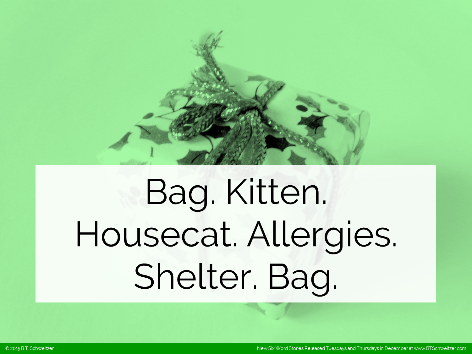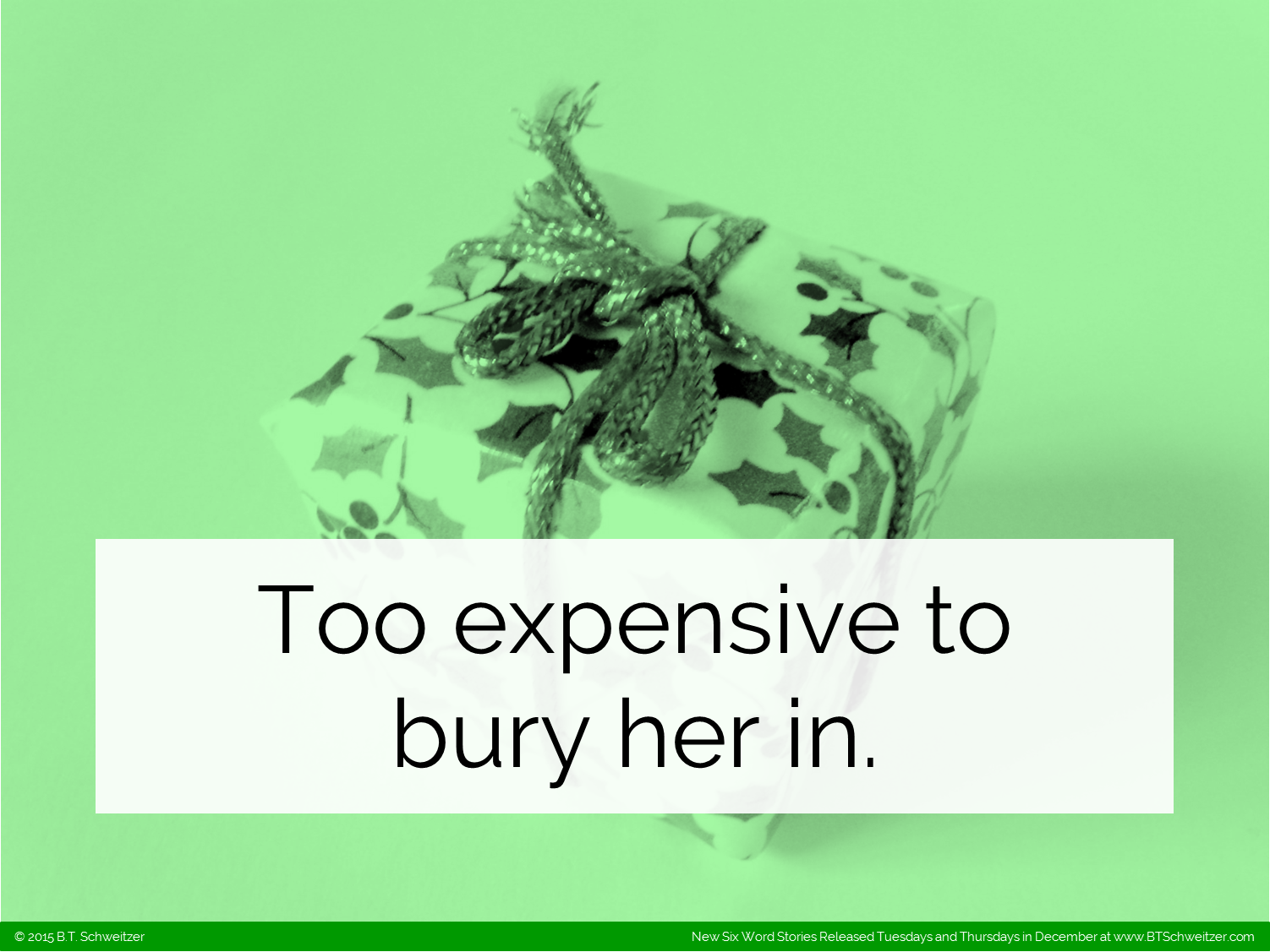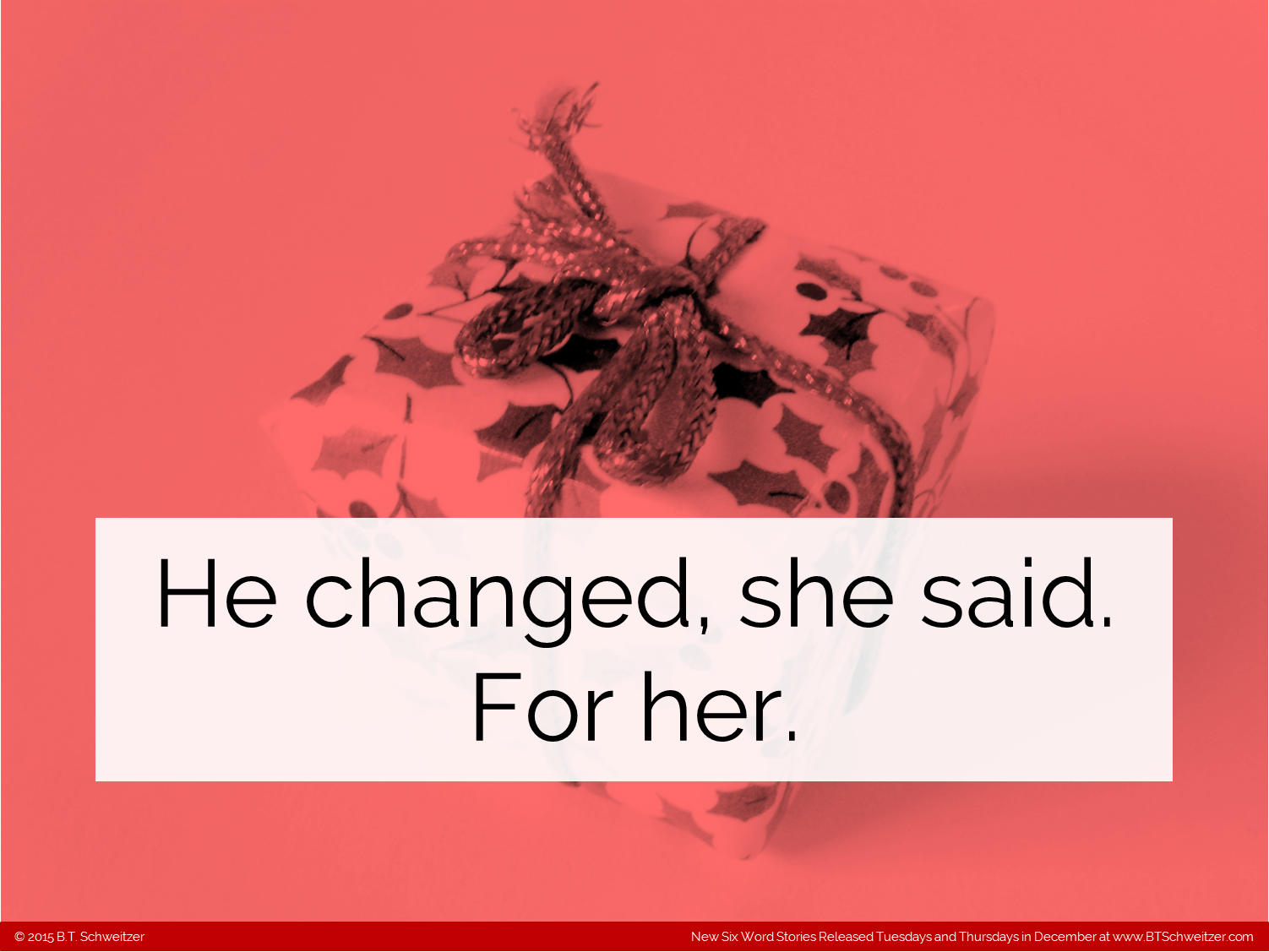 As my holiday gift to you all I'm posting 5 comps (4 Six-Words and 1 Two-Sentence) in the next 24 hours with another on Saturday and more to come next week. Also I extended this month's contest deadline to Monday and am allowing double the normal number of entries per writer. Please enter here: www.btschweitzer.com/contests/contestdecember2015/