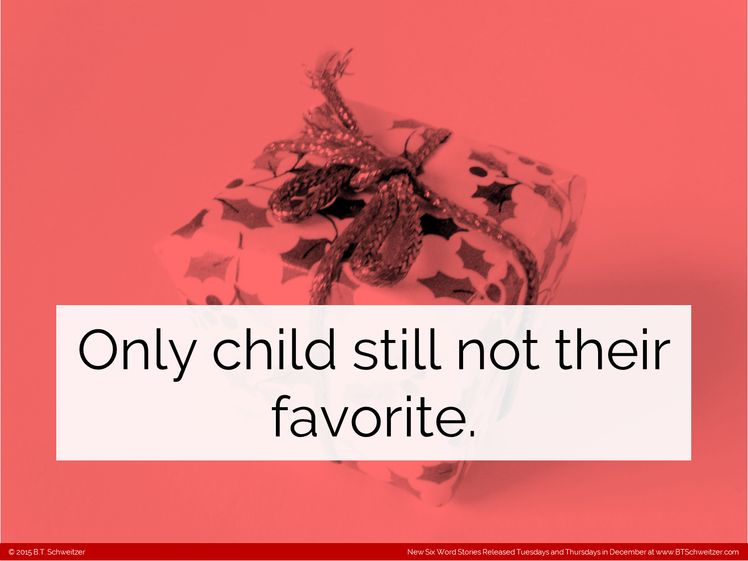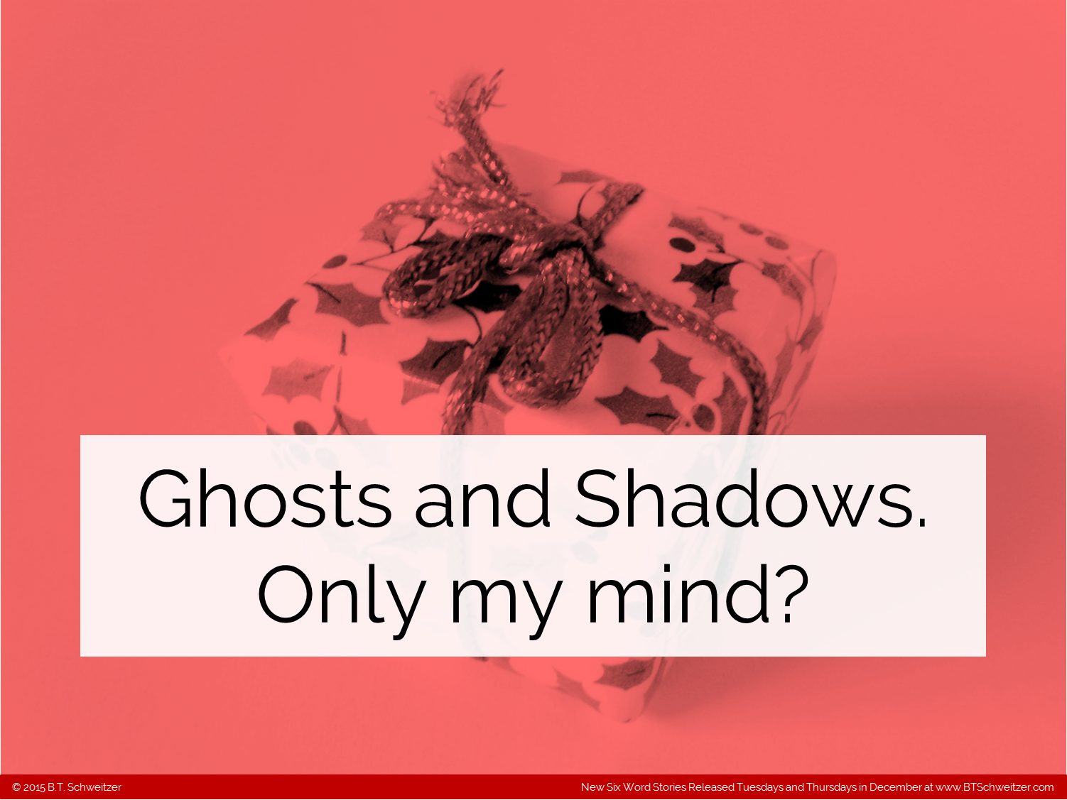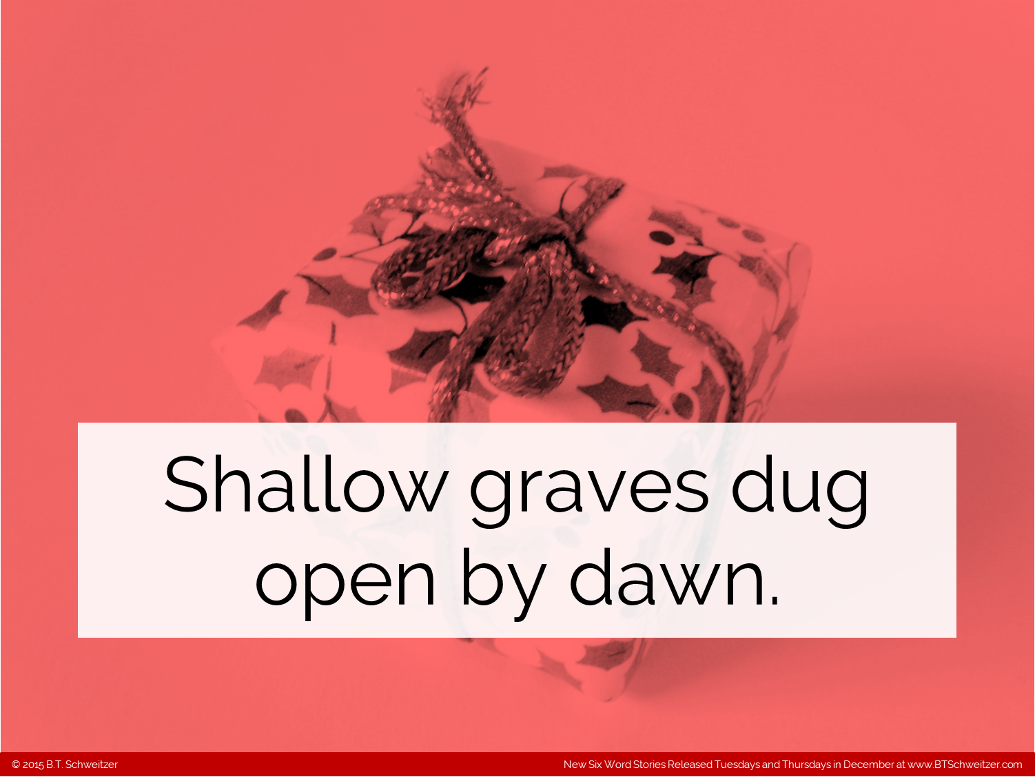 So here it is! By popular demand! (And I really do listen to comments that are constructive so speak up) I have to admit I had a great time writing them and think the skills will help make more concise and biting Two Sentence Stories eventually. Remember, I'm hosting a monthly writing contest on my site so please consider entering: www.btschweitzer.com/contests/contestdecember2015/.