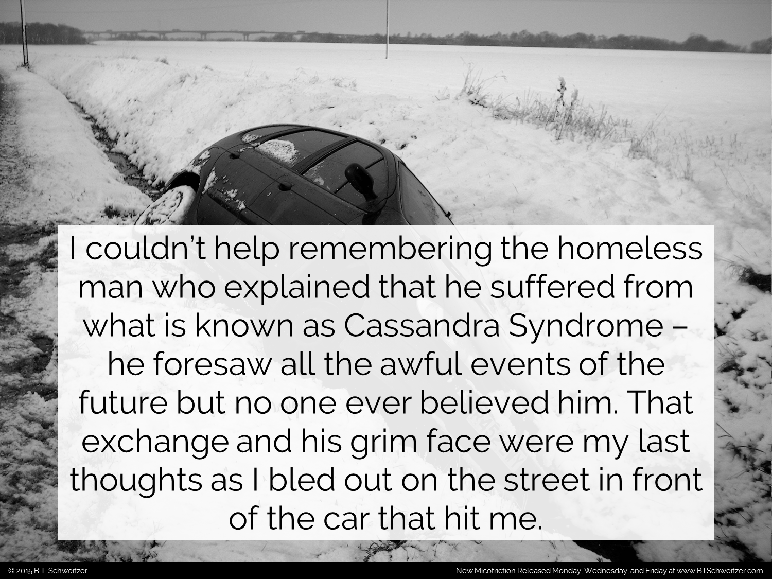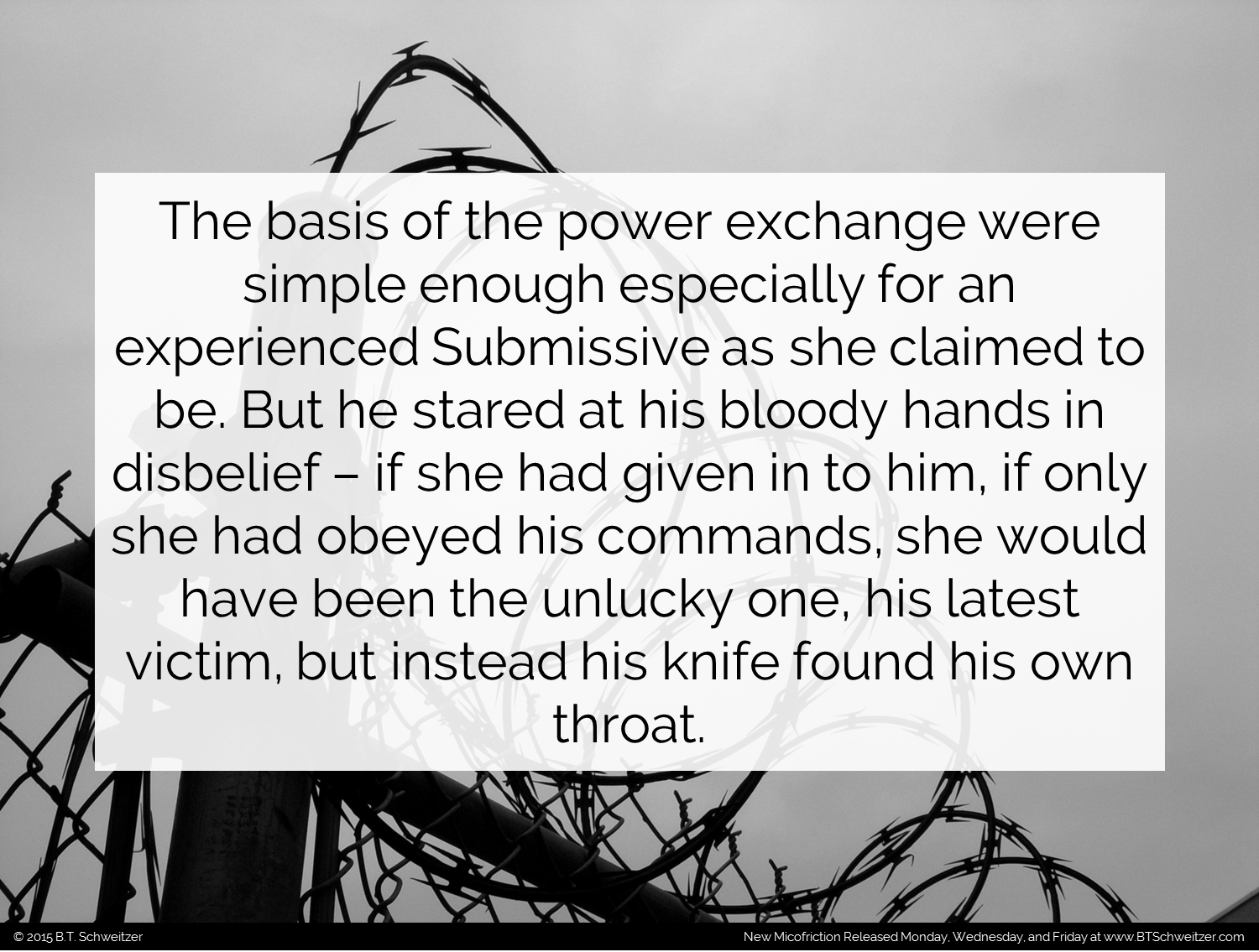 Welcome to our first week posting 2 comps. Our plans for October are under way. Remember I'm also hosting a writing contest that ends on 10/18. Here's the link: www.btschweitzer.com/contests/contestoctober2015/. As always I'm open to feedback and suggestions on how to improve my writing as well as what you'd like to see.