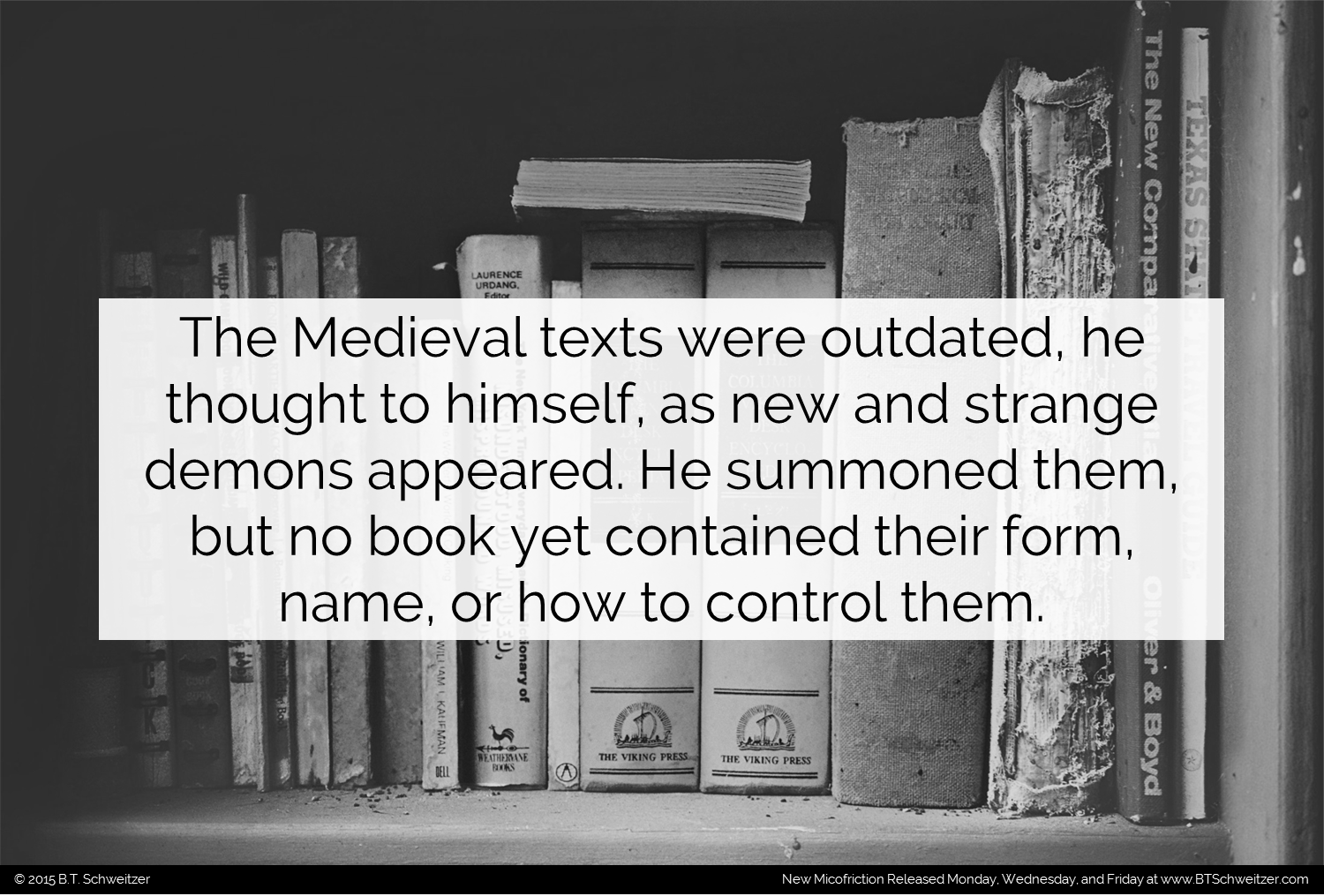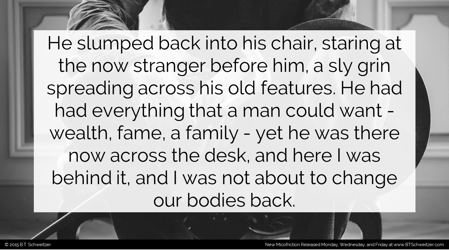 Everybody got their Halloween plans lined up? Better have your costumes ready we are halfway there! The writing contest I'm hosting ends this weekend on 10/18 so if you plan to enter you better do so quick. Here's a link: www.btschweitzer.com/contests/contestoctober2015/. Also remember I'm posting longer stories every weekend on my site based off previous Microficiton so if you have a favorite you want to see expanded go vote here: www.btschweitzer.com/collected-fiction/macrofiction/. As always I'm open to feedback and suggestions on how to improve my writing as well as what you'd like to see so comment or feel free to message me.