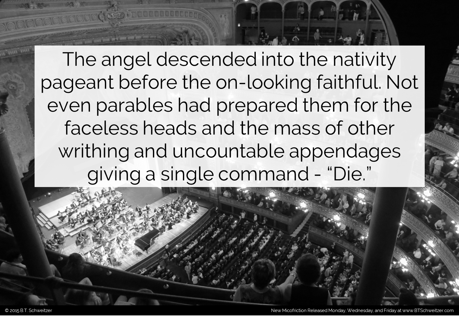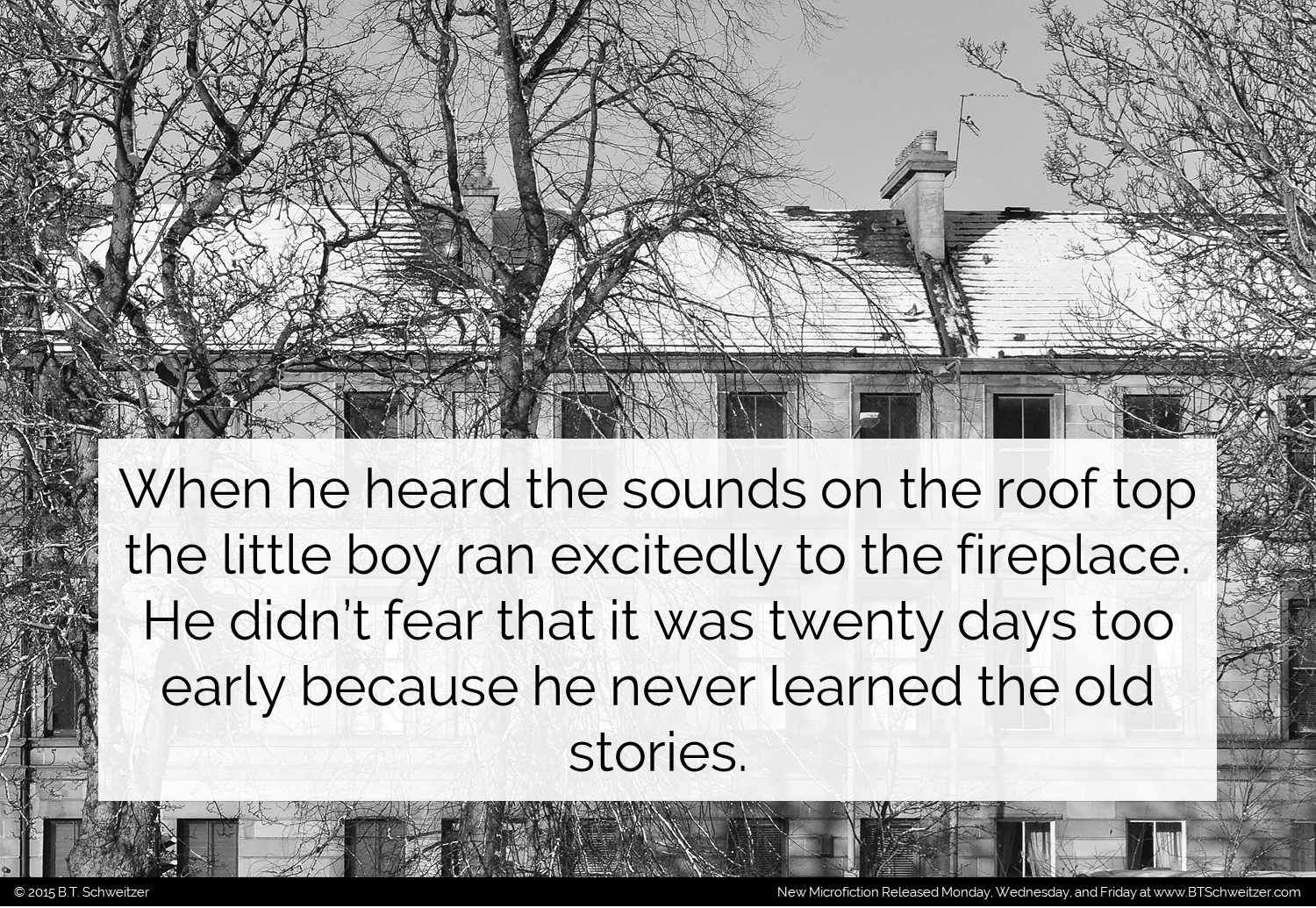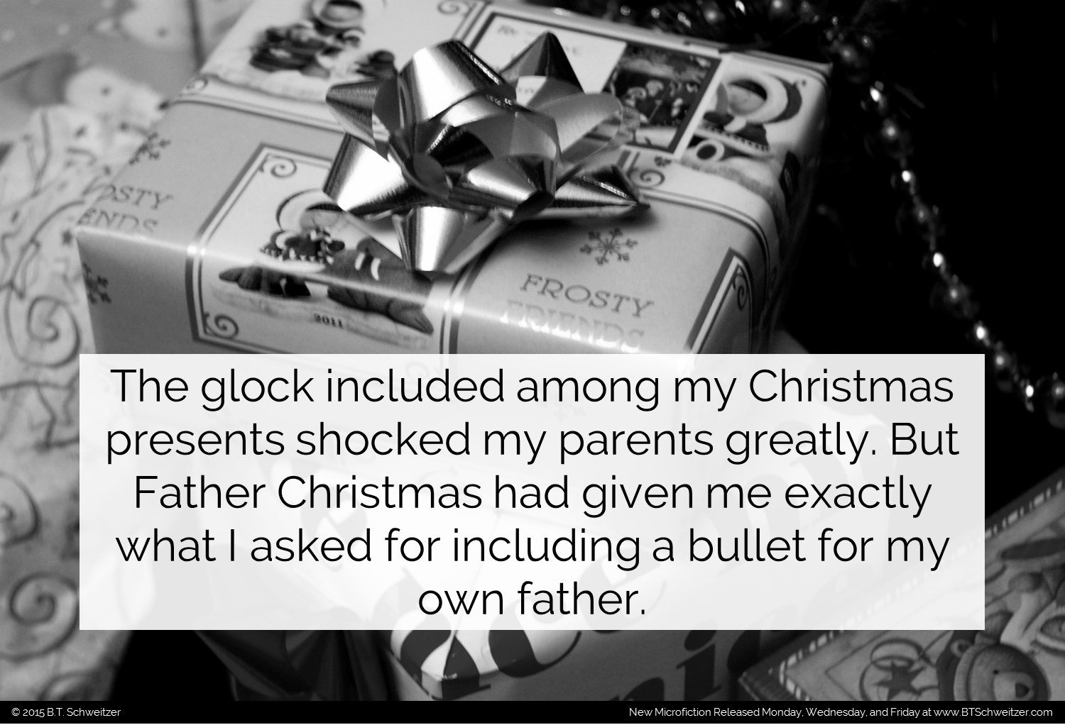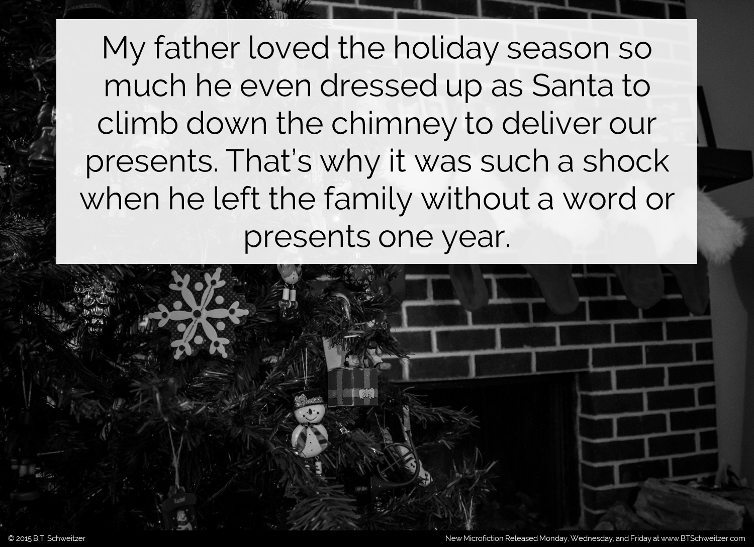 As my holiday gift to you all I'm posting 5 comps (4 Six-Words and 1 Two-Sentence) in the next 24 hours with another on Saturday and more to come next week. Also I extended this month's contest deadline to Monday and am allowing double the normal number of entries per writer. Please enter here: www.btschweitzer.com/contests/contestdecember2015/