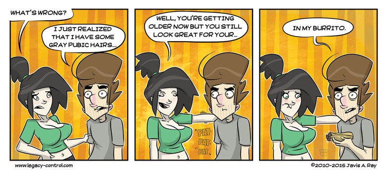 I do actually have some gray starting in my beard (which is a kind of pubic hair) and I have also found hair in a taco bell product so this comic is like 90% true.