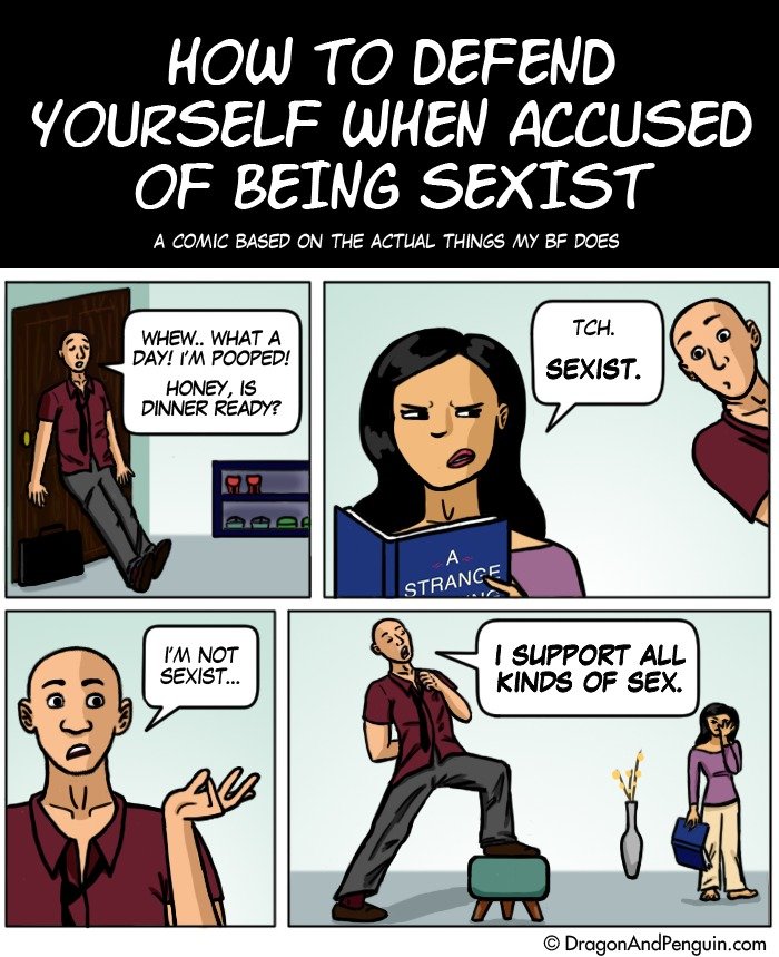 Due to the popularity of this comic, anyone want a T-shirt with the quote "I'm not sexist, I support all kinds of sex."? Because we want it. Leave a comment if you do!