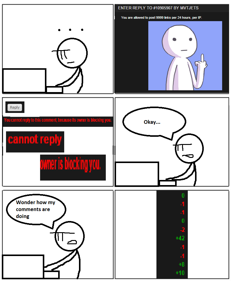 So I thumbed down a comment, got 5 red thumbs on my own comments from the user I thumbed down and I got my first hater. Yesterday was a good day.