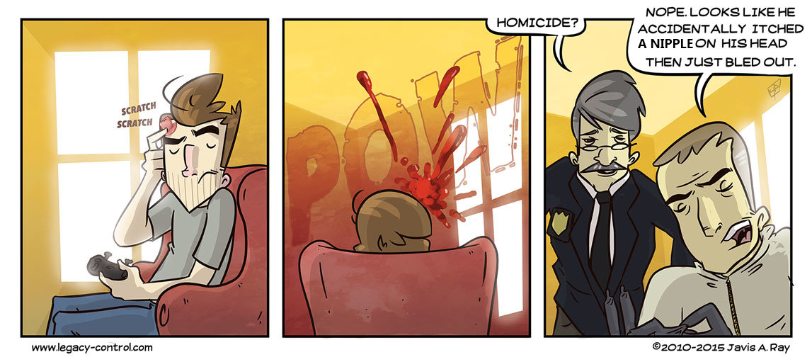 Sometimes head zits, when they are first birthed, itch a little. A poor fool who is distracted goes willy nilly scratches can cause a serious sucking wound. Always look before you scratch people.