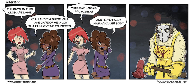 Killer bod. Flag myopicprophet Channel: oc-comic-makers (See more...) next random - Fav Favorite Comment ✖ Top NextComment (Enlarge) You can see the rest of my comics at www.legacy-control.com Girls love a guy with a killer bod...amirite? next Tags: webcomic | comic | Comic Strip | adult humor | humor | funny | killer | Axe murderer | dating clubbin | sex Killer Bod I LIKE A GUY '' AND FE . -ICALLY ... +132 Views: 9204 Favorited: 7 Submitted: 04/10/2014 Share On Facebook -Favorite +Favorite Unsub from myopicprophet Subscribe to myopicprophet Subscribe to oc-comic-makers Unsub from oc-comic-makers