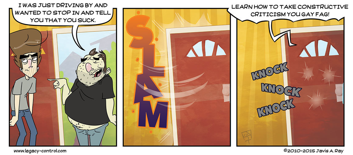 This is ture and as I have the ability to ban/block those who sputter useless dribble I will do so. "I hate your comics they are dumb your art sucks" is not useful critique. Not to mention ones personal tastes does not give one credibility in regards to the ever shifting sands of what is "good and bad." As a creator, I'm woefully and dreadfully aware of my short comings. I dwell on it, I agonize over it and I try every day to get better...for free. I see the point of a review for something that may save others from wasting money on a product or service but by the time you read a few negative "reviews" you'd have churned through 3 or 4 of my comics and have been able to make the decision on your own. My point is that people who post stuff about comics or any other form of entertainment on the web, generally don't want to provide useful criticism (again, especially since what is funny or good is subjective) they just want to be dicks.