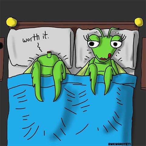 This is retarded. That praying mantis thing is a myth. The study that showed that females eat the heads of males after mating was flawed and inaccurate. They took random mantises and put in a foreign closed off environment devoid of food and had them mate. The woman bit the head off the male, in the wild they don't do that, its not part of their mating at all. It's perfectly safe to have sex with praying mantises, as long as you wear a condom, mantises are the whores of the bug world.