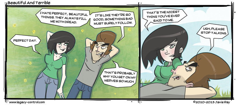 So beautiful, so terrible. Flag myopicprophet Channel: oc-comic-makers (See more...) next random - Fav Favorite Comment ✖ Top NextComment (Enlarge) You can see the rest of my comics at www.legacy-control.com/ Good things really do give me a feeling of dread. next Tags: webcomic | comic | Comic Strip | Love | Relationships | Dating Beautiful And Terrible scan. SOMETHING .-i. SAID To ME HEEL? FALLOW. d LIETH. PLEASE TALKING. qfl, Jarvis Pay ... +213 Views: 13842 Favorited: 13 Submitted: 05/01/2014 Share On Facebook -Favorite +Favorite Unsub from myopicprophet Subscribe to myopicprophet Subscribe to oc-comic-makers Unsub from oc-comic-makers