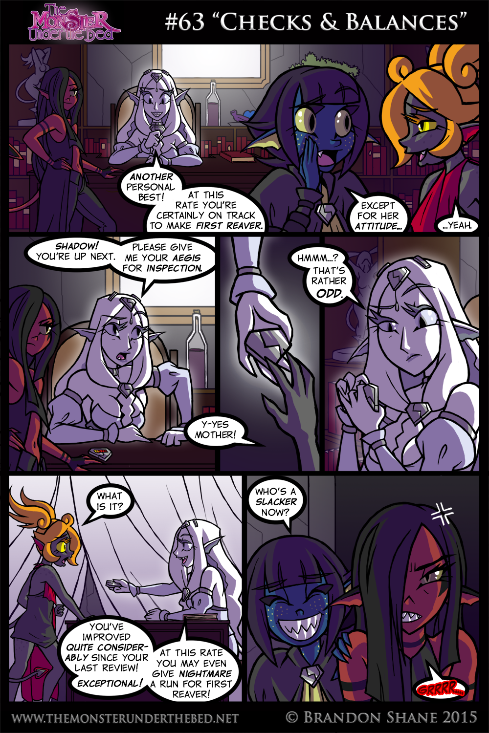 I'm willing to bet that those badge thingy majjigs record (somehow) how much fear she has caused or been in the presence of (or something along those lines). She spends nearly all her free time with Tim, whom it has been established is more afraid of Shadow than anything else (though not for typical reasons). The only difference between her last inspection (which we can assume went horribly) and this one which is apparently drastically better, is Tim. More evidence of this was shown the first time we see her world in which her presence in Tim's fear was nearly crippling as she had to take a moment to gather her senses before moving on.