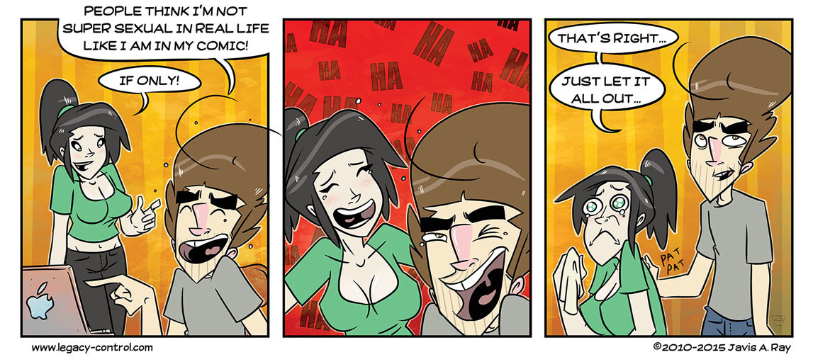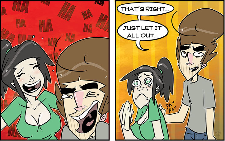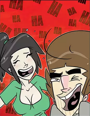 His girlfriend laughs along with him as the concept of him not being really sexual is the complete opposite of the truth. She then becomes upset because she is frustrated at him because of this.