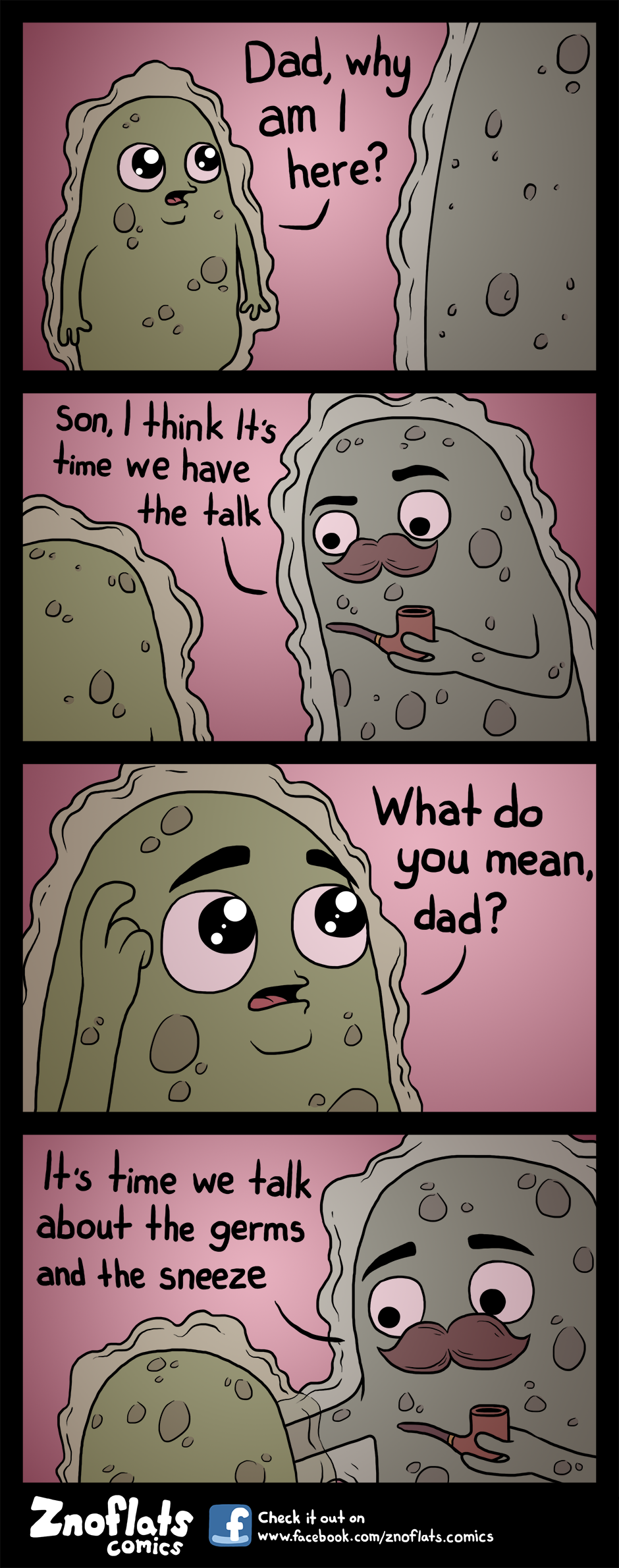 I think that in case of germs the correct answer for "why am I here?" is the explanation for how germs spread. For that sneezing/diarrhea/mucous contact is better alternative than mitosis, IMO.