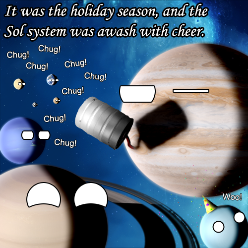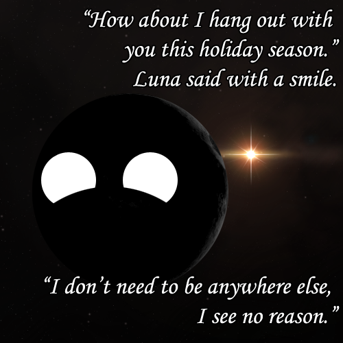 Meanwhile, in the Solar System party, present Terra is celebrating with present Luna.