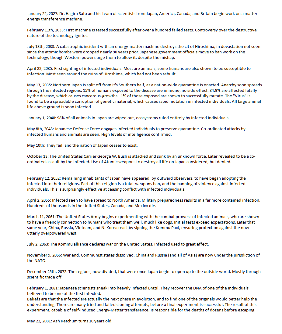 February 1, 2081: Japanese scientists sneak inte heavily Infected Brazil. They recover the DNA ene the individuals