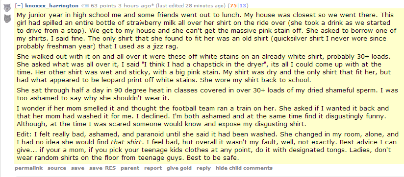 that her mom had washed it fer me, I declined. I' m bath ashamed and at the same time find it disgustingly funny,