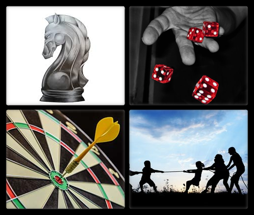 He explodes into a cloud of bright yellow game pieces and glowing white dice. There is an immediate shift in the atmosphere of the room, and four obelisks rise up from the floor. Each of them depicted a different game skill or competitive edge.