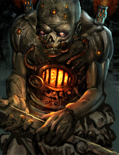 The next room is quite warm, and you can hear the mechanical clink and clang of brass pipes and plates making repetitive contact. There's a lot of oily smoke in the air, and you can barely perceive an orange glow approaching you. As it gets closer, you identify it as some kind of animated corpse, with a coal furnace where its organs would be. The creature is clumsy, and breaths thick black smoke every few seconds. It is brandishing a large metal axe, and coming toward you menacingly.