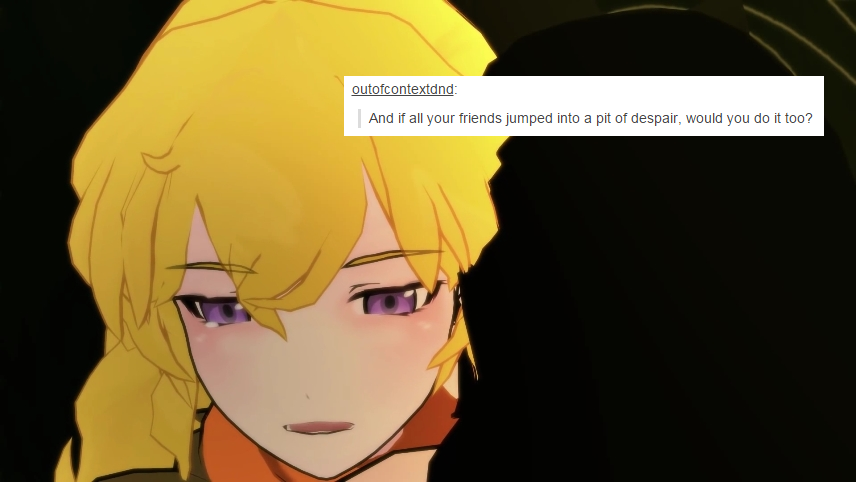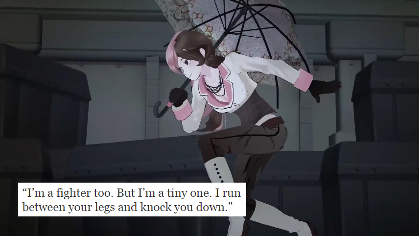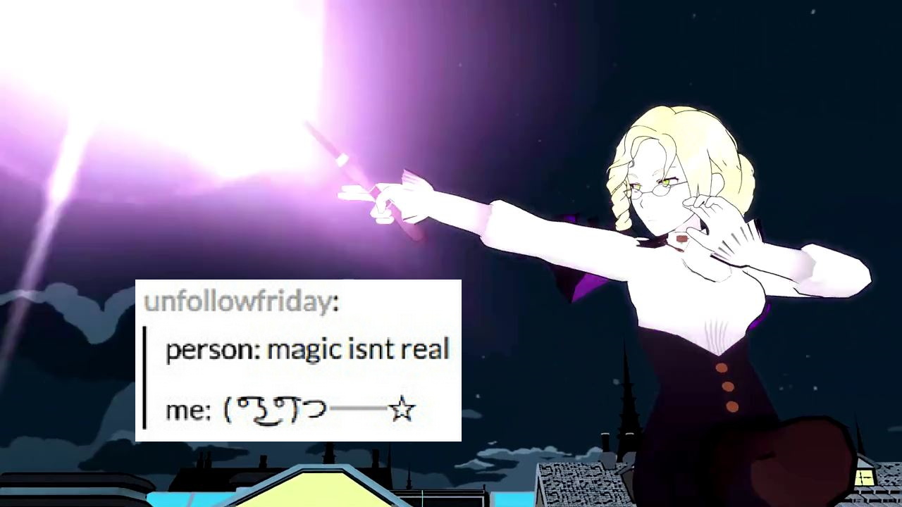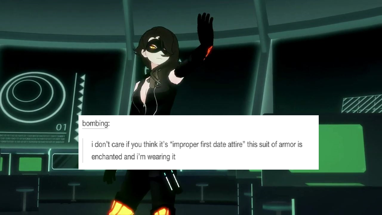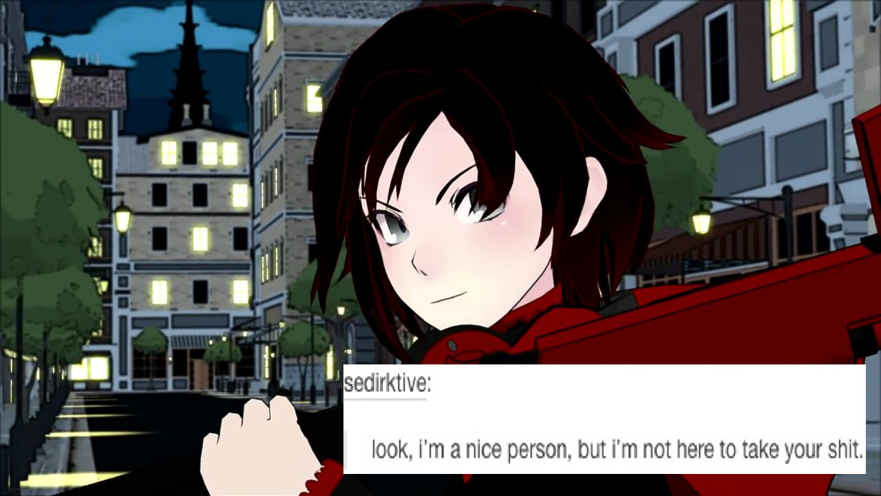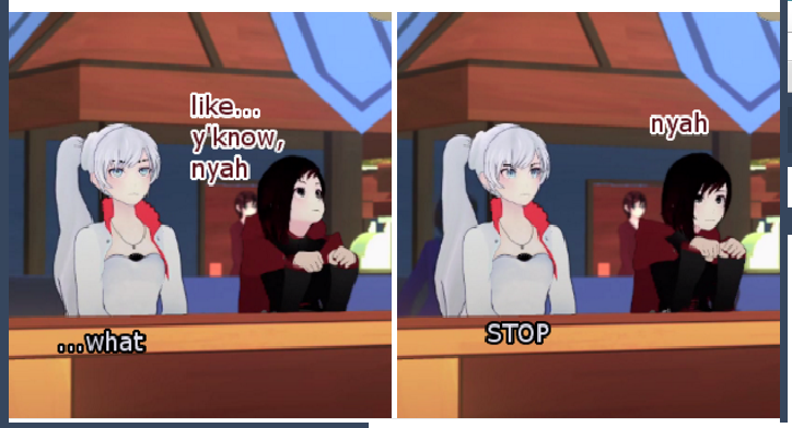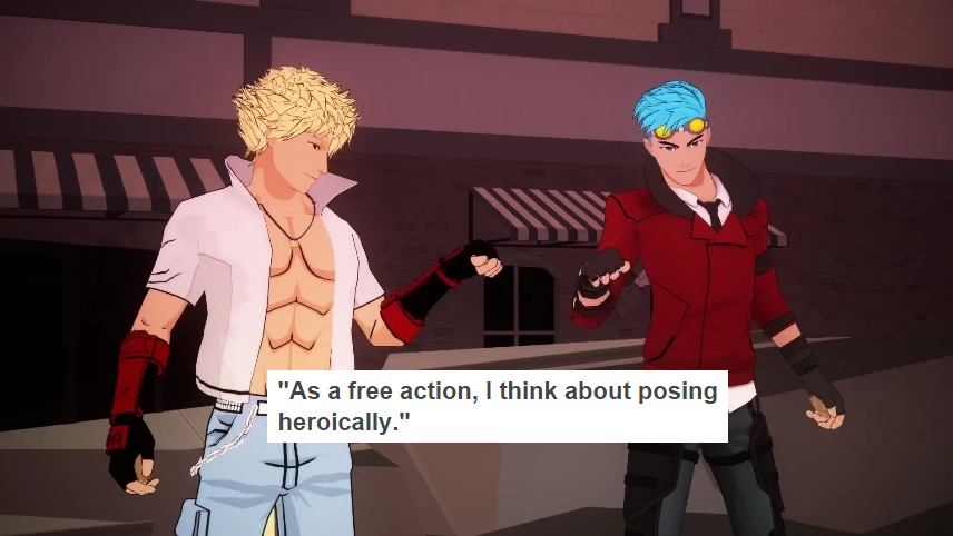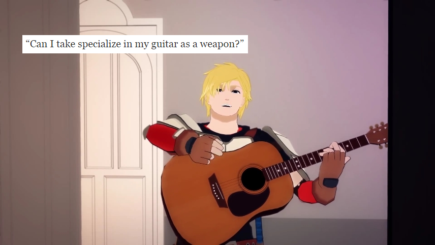 That's what I appreciate about it. Rooster teeth just wants to have fun and share the fun. RWBY is not a serious cartoon/anime, it has it's moments but for the most part you are supposed to be in awe at the combat and laugh and the jokes. At least that's how I view it. You laugh at Zwei and dog physics, get pumped and the awesome fights, and then look at the screen weird as you remember that everything, including hoverboards, in the universe is a gun.