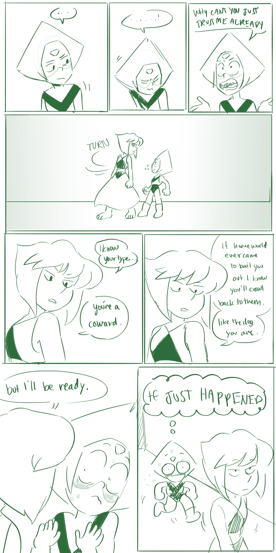 wait a minute, peridot fighting the gems, but also riding with lion. im conlifcted. and im also sad. they could of gone with full character development on bringing her to the good side and they are gonna puss out and just shoot her back over to evil.
