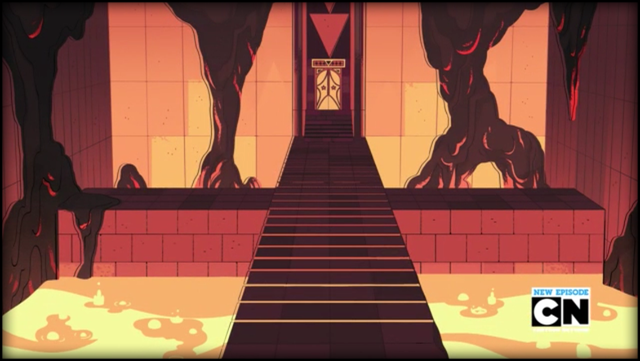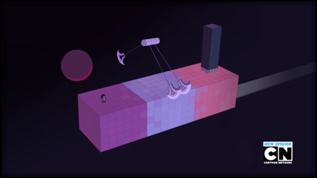 In the episode, the gems put together a hastily made dungeon for Steven to walk though- we imagined that it would function like a buggy video game. To top it all off, the gems didn’t even have time to build an outer skybox. SU is a very design intensive show, with tons of unique props and backgrounds in every episode. The Test on the other hand was deliberately limited in scope- it was very important to us that he’s traversing the same location with the same props and effects. To do more with less.