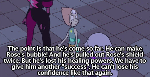 Steven sees that their confidence is the one that’s broken. He understands what THE GEMS need and recognizes that even if the whole thing was rigged, the Gems made the dungeon to make him feel better. They made it because they’re only doing the best they know how. They love Steven dearly and don’t know how to give him exactly what he needs, but they’re TRYING. And he sees that and gives them exactly what THEY need in return. A little boost of confidence. A little confirmation that they done good and he’s proud of them for doing what they’re doing for him.