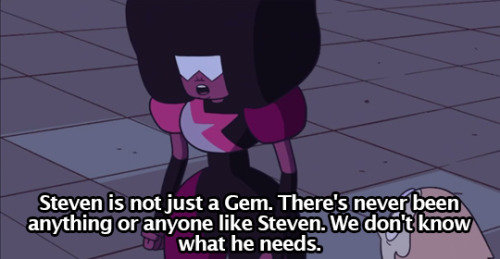 Even Garnet points out that they might not be suited for this. They had motherhood kind of thrust on them, and though they’ve been trying their best, it’s almost never clear if what they’re doing is right.
