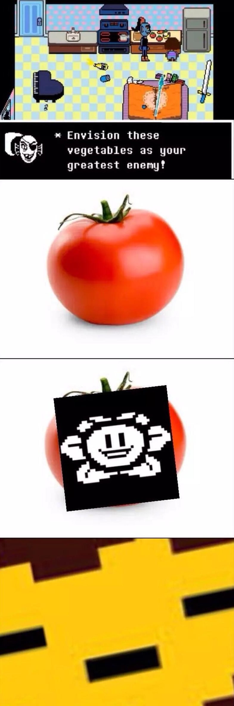 You eat the spaghetti, you are filled with nausea but manage to go on despite that your body tells you to stop. Sans is horrified by this insane self torture as Papyrus smiles filled with joy for your passion towards his spaghetti. You finally find the tomato, you stare at each other, determined, you leap at the tomato and.... Give it a careful pet! Undyne frowns at your shinenigans.