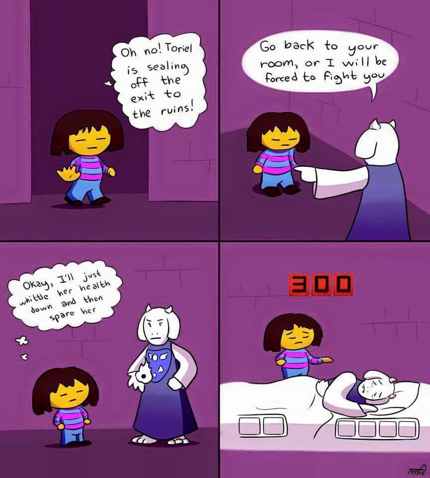 I actually looked up how to stop Asgore after dying to him the 10th time because I was trying to just wait it out until he gave up, like everyone else. When I found out you /had/ to fight him, it was like... just out of no where. I know they kind of hint that you can't spare him with how he breaks your mercy bar, but I figured that was more so for locking away the 'flee' option.